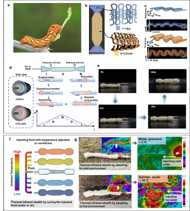 3. 结构异构针织结构开发爬行运动与红外伪装功能的软体机器人。a 皮肤有褶皱的毛虫照片。b 仿生软体爬行机器人的针织编码设计图与结构模型。c 罗纹线圈横向(上)与双反面线圈纵向(下)的波纹截面图。d 软体机器人的设计原理与运动方式。e 单压力源驱动的软体机器人连续爬行过程快照。f 流体循环实现红外伪装的原理示意图。g 通过向机器人注入低温和常温流体实现红外伪装