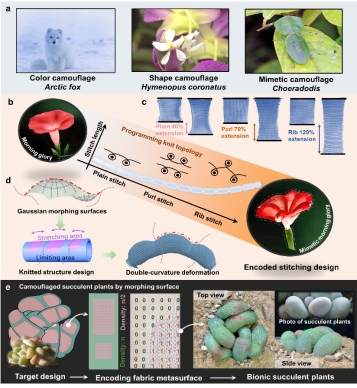 近日我院纺织结构材料交叉技术研究室孙丰鑫研究团队联合德累斯顿工业大学、劳伦森大学及上海国际时尚教育中心的研究人员,设计了一种新型柔性可编程纺织品超表面。这种材料可用于开发具备类似变形与伪装能力的机器人,相关研究成以题为Structurally Programmed Textile Metasurfaces for Soft Morphing Robotics and Bionic Mimetic Camouflage”发表于Advanced Fiber Materials。其核心是通过调整交织纱线线圈的几何排列,实现针织结构的精准工程化设计。研究人员提出一种基于结构驱动的设计框架:通过在编织外壳中引入空间局域的应变约束,仅凭针脚几何的调控,即可赋予软体机器人系统与仿生伪装所需的形态变化能力。结合改进的超弹性力学理论分析,将织物宏观力学行为解耦为针脚拓扑与纱线组成的独立作用,并通过几何调控实现了可编程的力学响应。