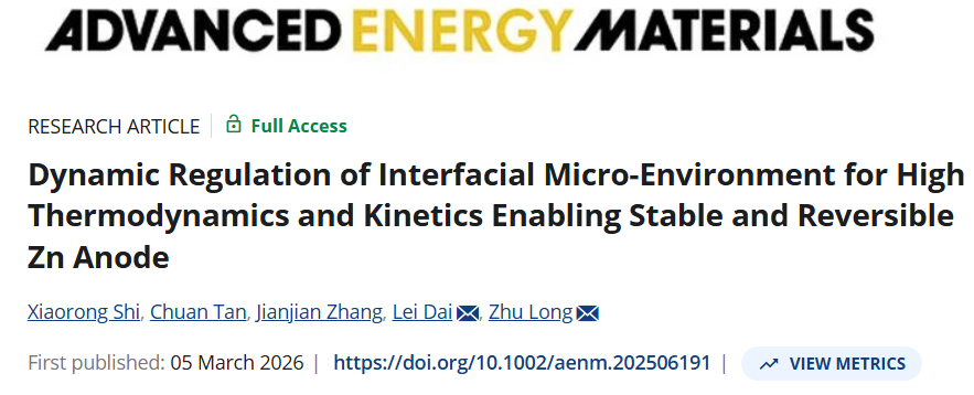 近日,我院短纤维功能材料研究室龙柱教授团队在水系锌离子电池领域取得了重要研究进展,研究成果以“Dynamic Regulation of Interfacial Micro-Environment for High Thermodynamics and Kinetics Enabling Stable and Reversible Zn Anode”为题在线发表在《Advanced Energy Materials》(IF=26,中科院大类一区TOP期刊)上,论文第一作者为我院博士研究生史肖蓉,通讯作者为龙柱教授和戴磊教授,江南大学为唯一通讯单位。