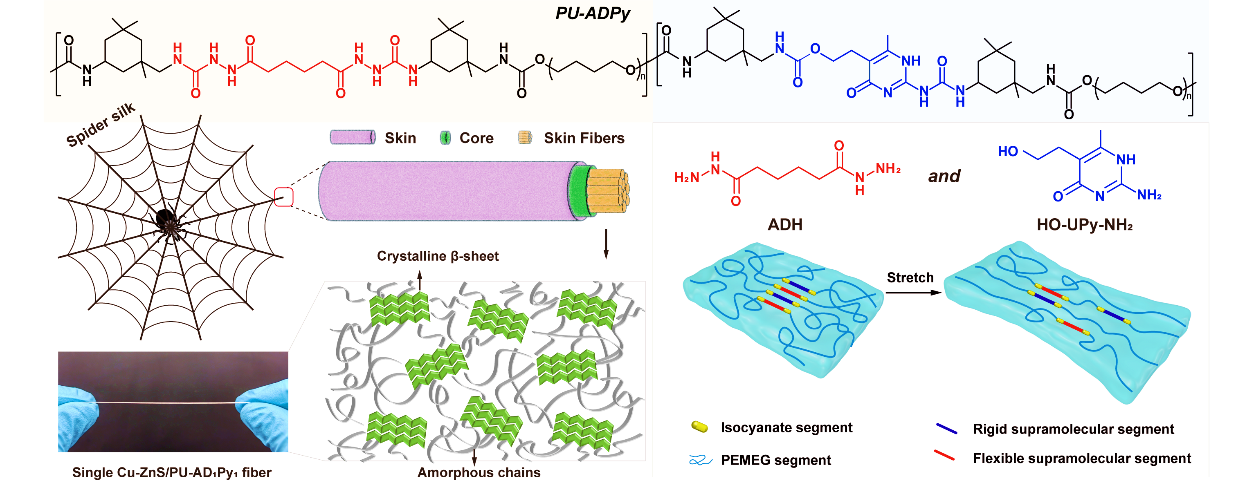 近日,我院王潮霞教授联合荷兰格罗宁根大学Katja Loos教授,采用错位互配效应平衡聚氨酯-脲网络内超分子结合强度和能量耗散性能,通过引入柔性和刚性芳杂环超分子片段扩链剂成功制备了一种仿蛛丝结构氢键阵列型高机械强度、高延展性室温自修复聚氨酯-脲长余辉发光纤维。