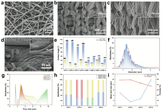 图2a-c显示了制造好的复合织物三层结构的照片,图2.d显示出织物和纤维膜之间结合良好。CFP具有从内向外的纤维直径梯度分布。孔隙含量适中,空气可以自由地通过这些孔隙进行流通,人体产生的热量可以迅速散发出去,从而保持身体的凉爽和舒适。