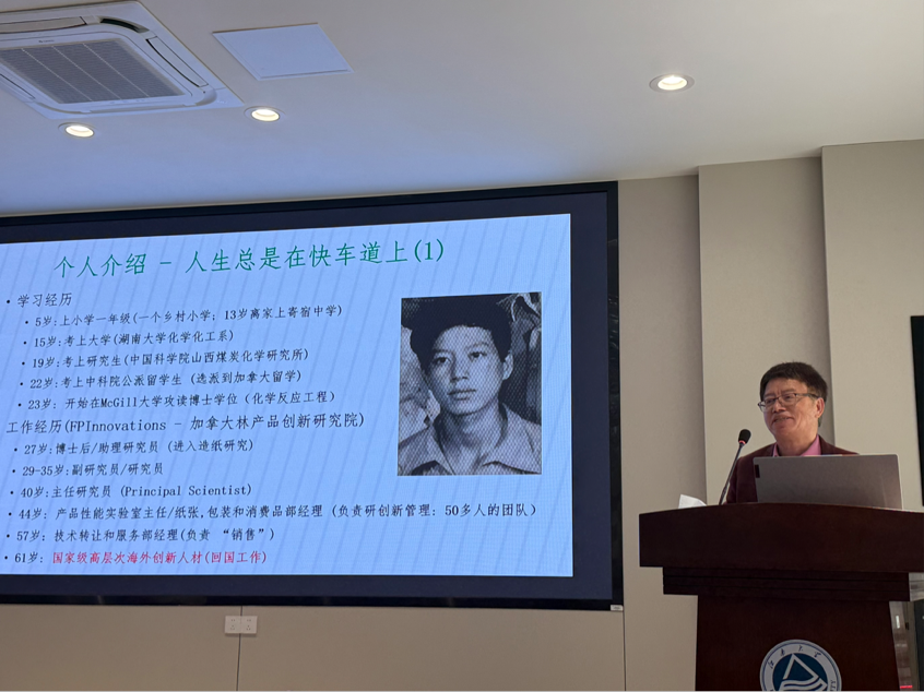 短纤维功能材料研究室邀请了邹学军博士莅临交流,并作了主题为“大型化学浆厂的未来——绿色制造/生物材料/生化产品”的学术报告,邹博士围绕化学浆厂行业发展、绿色转型路径展开深度解析,同时结合个人成长、家庭经历分享人生感悟,为在场师生带来专业知识与人生规划的双重启迪。