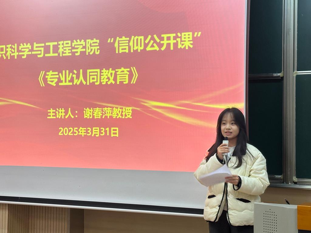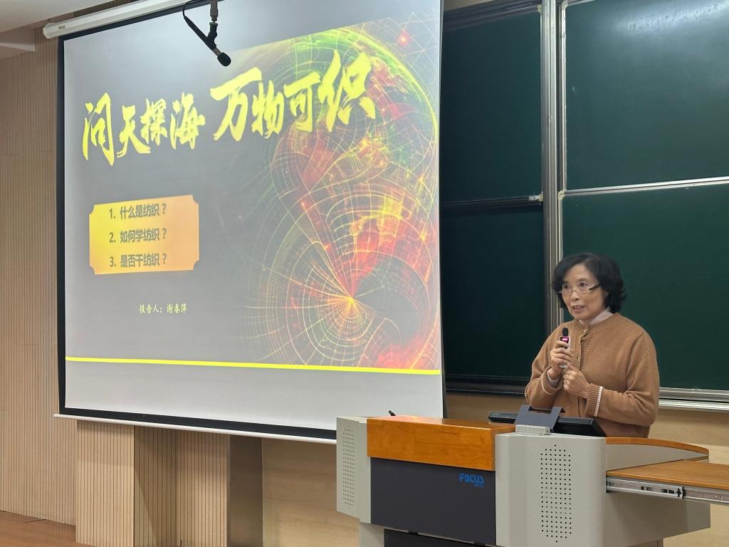 在第一教学楼1B103举办“专业认同教育”信仰公开课。江南大学特邀报告员、学院关工委委员谢春萍教授担任主讲嘉宾,学院辅导员孙慧及2024级全体本科生参与本次活动。活动由团委通讯社李佳雯主持。