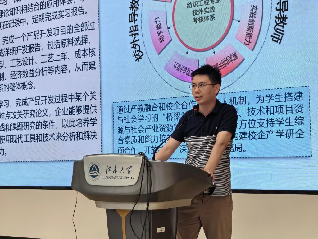 会议伊始,周建系统阐述“卓越工程师教育培养计划”的背景与意义,介绍实施方案与具体要求。他提到,2022级全体纺织工程学生将进入覆盖纺纱、机织、针织三大方向的25家优质合作基地开展实践,通过“校内+校外”双导师制培养,实现从课堂理论到产业落地的跨越式成长,共同构建校企产学研全面合作、开放共享、深度融合的新格局。