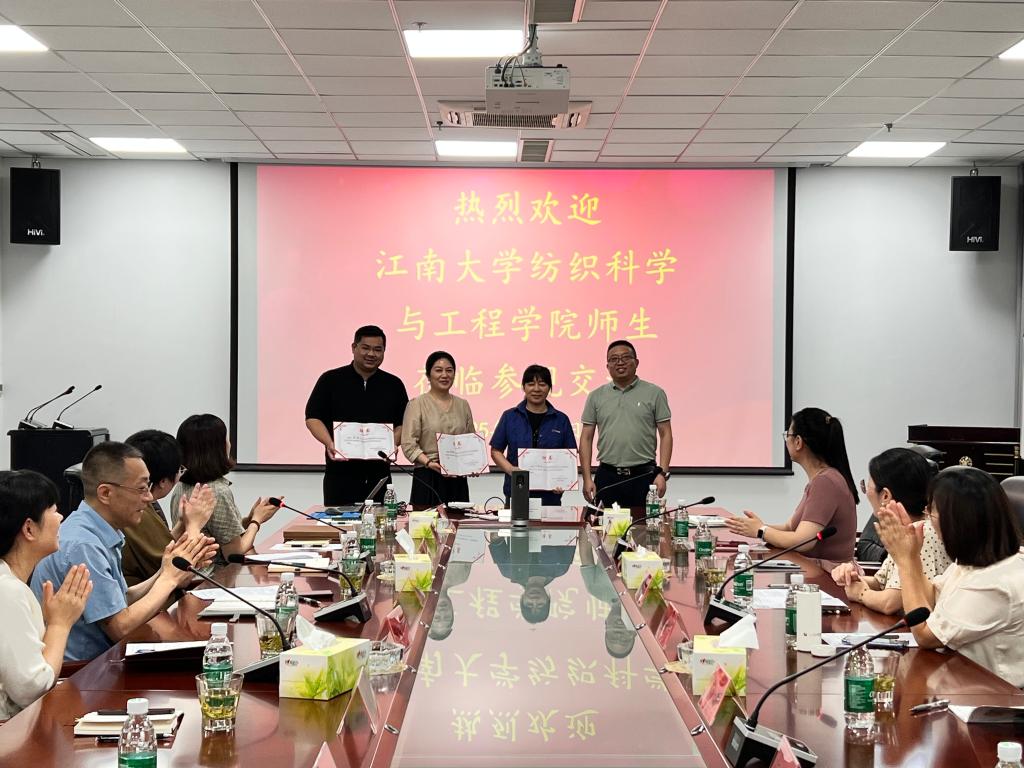 张丽平从专业学科特色、人才队伍建设、科研创新成果三个方面展开,详细介绍了学院近年来发展历程,期待持续深化合作共同培养符合行业需求的创新型、应用型人才。杨莉勤就企业人才需求做深入调研交流,期望构建校企“双向赋能”育人新格局,凝聚育人合力,着力培养纺织拔尖创新人才。最后,杨莉勤向企业颁授江南大学“大学生就业最佳合作伙伴”铭牌。殷允杰为卞晓云、潘磊和贾宝云颁发“校外实践导师”聘书。
