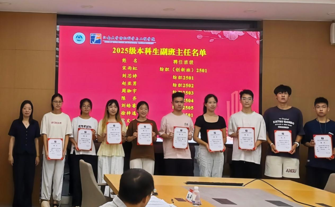 召开2025级本科生班主任培训会议。学院党委副书记、副院长杨莉勤,优秀班主任代表、纺织(创新班)2401班班主任李蔚,2025级本科生辅导员孙洲龙,全体2025级本科生班主任及副班主任参加会议。