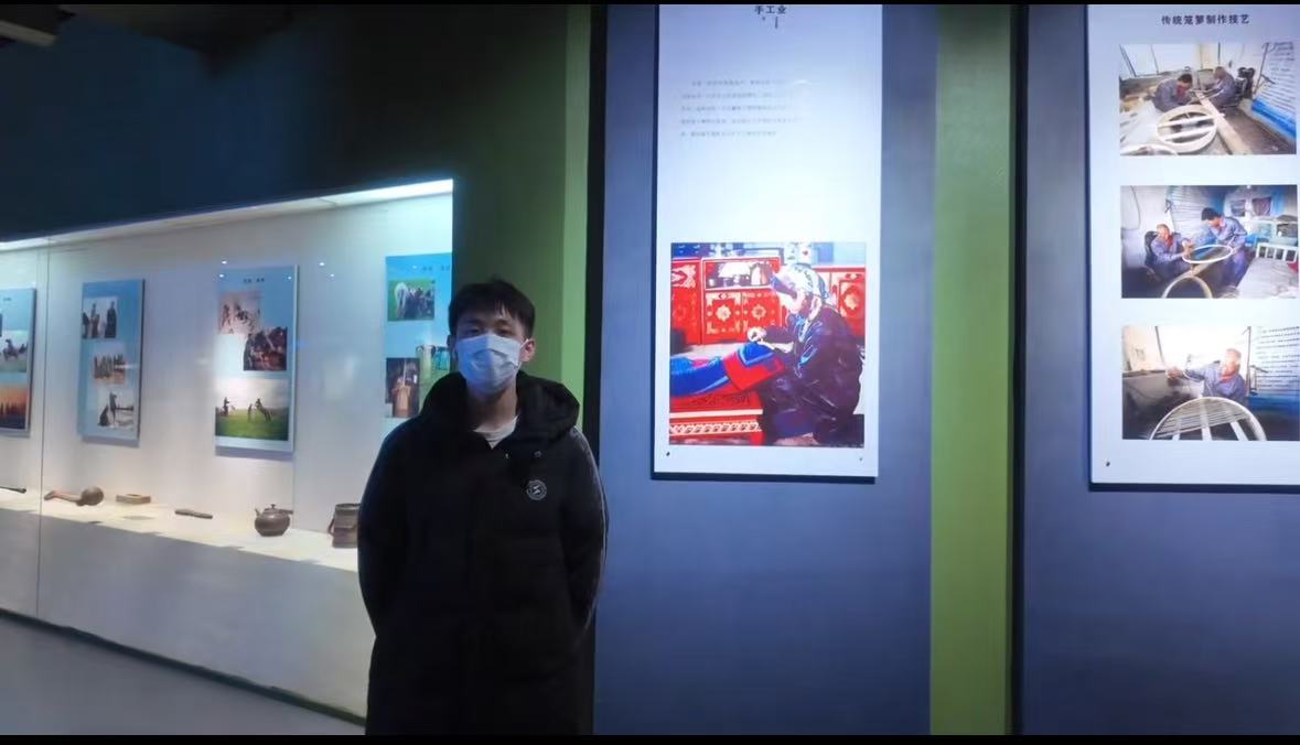 张旭同学在内蒙古蒙元文化博物馆开展蒙古族纺织文化宣讲活动,围绕馆藏蒙古妇女头饰、内蒙古碗袋、四大非遗服饰及毡绣展开讲解,近距离探究馆藏织物的工艺细节。他感受到传统纺织织物从草原日常用品变为博物馆展品的文化断层,也深刻理解到蒙古族纺织不仅是手工造物,更承载着民族的情感期许与文化内涵,是人与自然、人与牲畜、人与神明之间的独特精神联结。